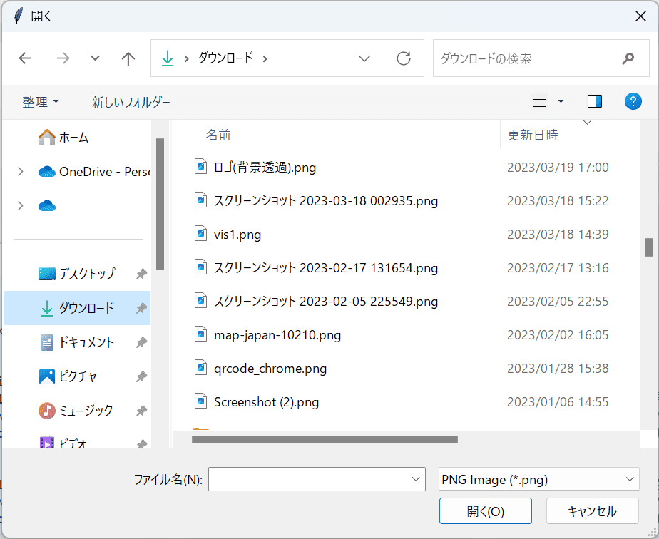 指定する場合は(“{拡張子の説明}”,”{拡張子}”)という組み合わせのタプルを配列に格納してからfiletypesに与えるだけで、例えばPNG画像だけを表示するためには次のように指定します。